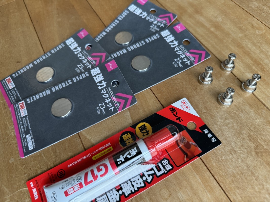 当初の予定では↑これらのアイテム (ダイソーの超強力マグネット|カインズのパンチボード用マグネット)を使用して、しっかりと固定する予定だったのだが失敗に終わる。