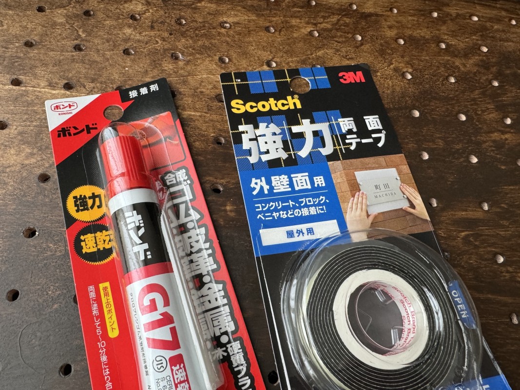 磁石がダメなら残された接着方法は、接着剤か屋外用強力両面テープである、接着剤は失敗すると汚れが取れなくなってしまうリスクがあるので、まずは強力両面テープを使用して試しに数時間様子を見てみたが、やはりアルミとテープの相性が悪く落ちてしまう。。