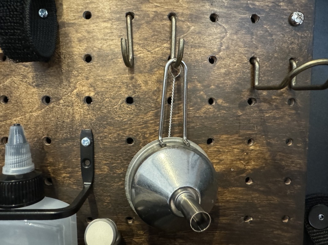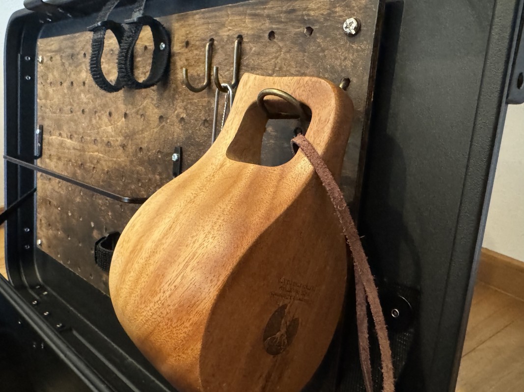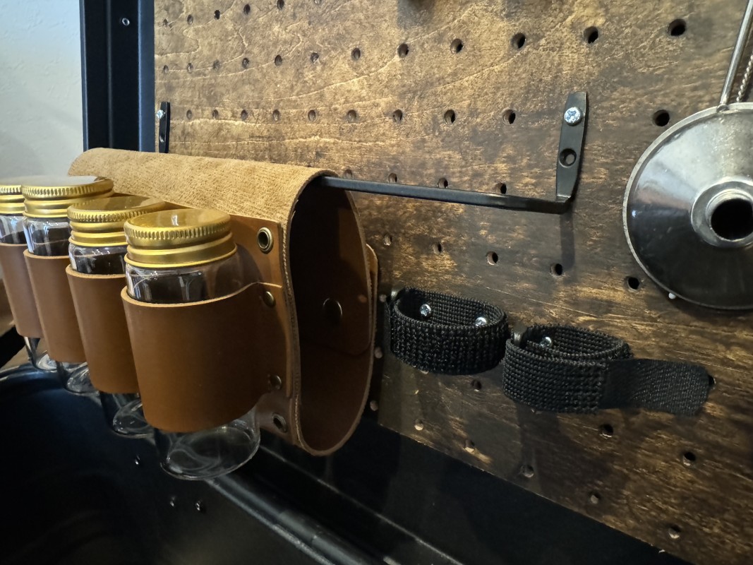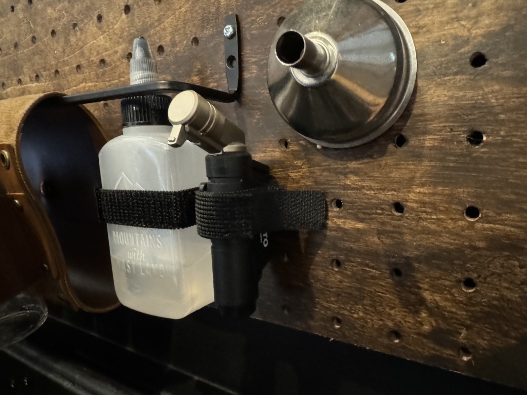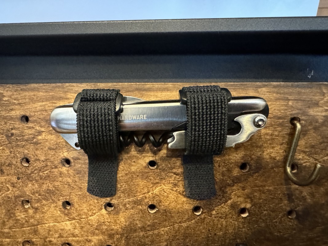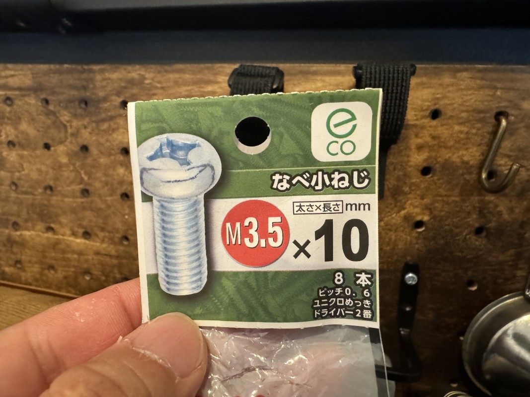 M3.5というサイズのネジ自体が割と珍しいのかもしれないが、このサイズがパンチングボードの穴にピッタリなので10mmの長さを購入し、ダイソーで買った伸縮ゴムファスナーバンドを組み合わせてボードに固定すると、ナイフやオイルケース・マイクロトーチ(バーナー)などをしっかりと固定できる。