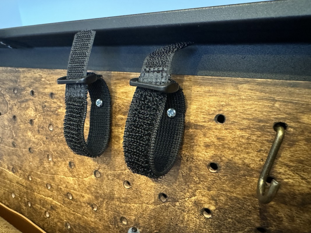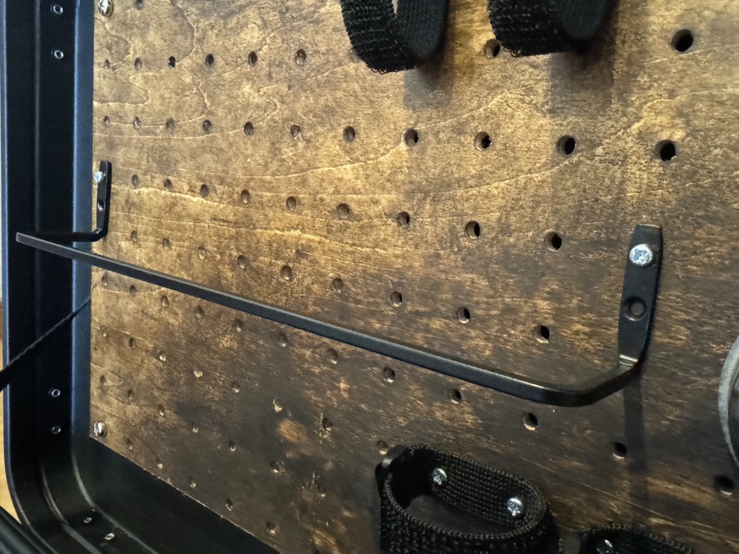確かにこれだけのアイテムを引っかければそれなりの重量になるわけなので、本来ならコンテナに穴をあけてビス留めしないとダメなんだろうというレベル。 ただ今回はどうしても穴をあけずに設置したかったので悪戦苦闘したのだ。