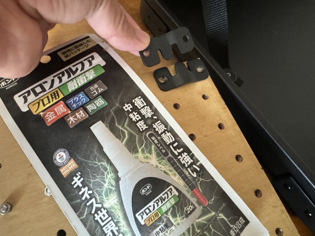 額縁を引っかけるためのフックを使用すれば着脱もできる!! あとは何で接着するかだ!! ということでイチかバチかプロ用というすごいネーミングのついたアロンアアルファを使用してみることにした。
