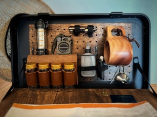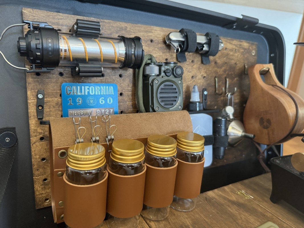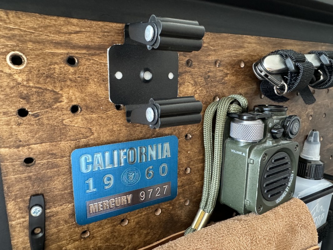 アルミコンテナの一番カッコイイ部分といっても過言ではない、蓋裏に設置されたパンチングボード、何度接着しても重さで落ちてきてしまうというトライアンドエラーが続き、ようやく額縁フックで安定。