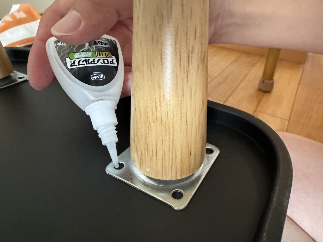 まずは仮留めで場所を入念にチェック、今回もコンテナに穴を空けたくないので超強力アロンアルファの登場。 脚自体はネジで固定できるので、積載などで必要ないときはコンテナから着脱可能。