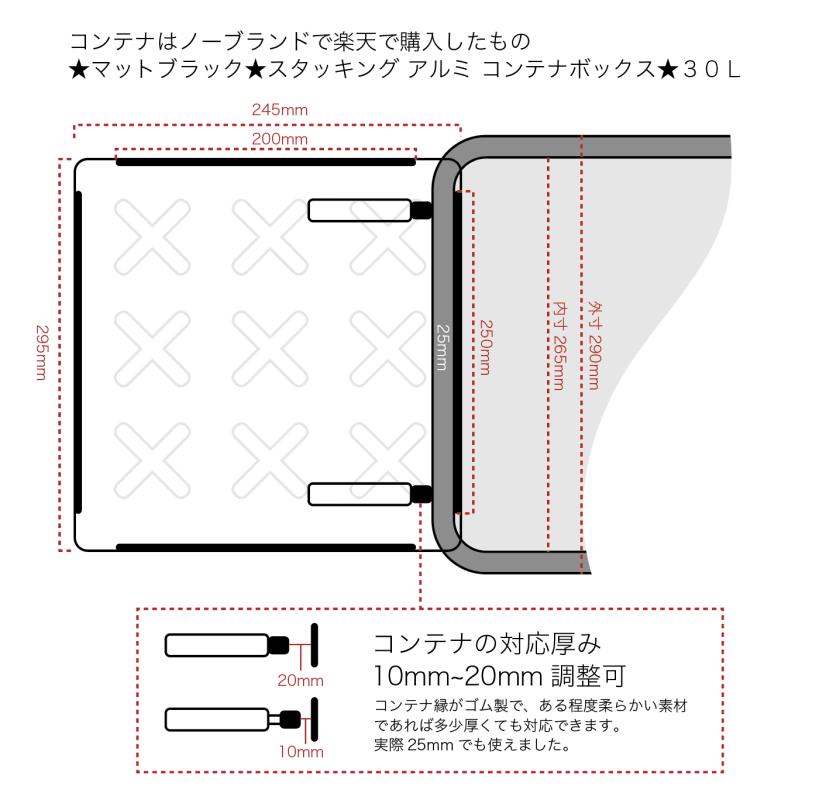 Amazonなどで他社メーカーのコンテナが使えるかどうかのQ&Aが見られたので、参考までに天板の使い方とサイズを計測したデータを掲載。 天板の商品名には30L・50L汎用と記載されているが、コンテナの内寸サイズが上記のサイズを上回っていれば使用可能かと思われる。またコンテナの厚みは多少厚くても使用できる、実際私のコンテナは25mmでゴム製だったのでしっかりハマった感じ。