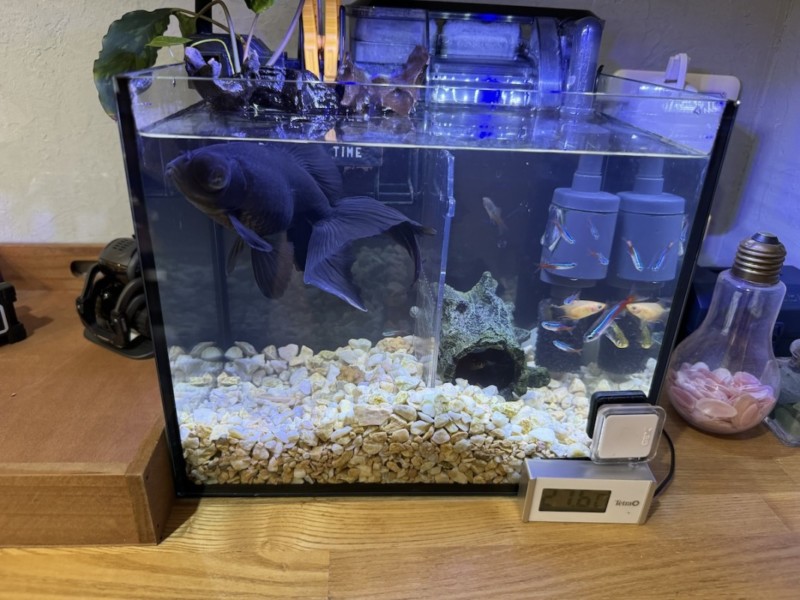 実は子供たちが小さいときに縁日で取ってきた出目金はまだ長生きしており、今回このようにワンルームをセパレートする形で共存に成功した。 小さな魚たちは左右行き来できて、出目金は左のみで生活するという、大変平和な住環境である。