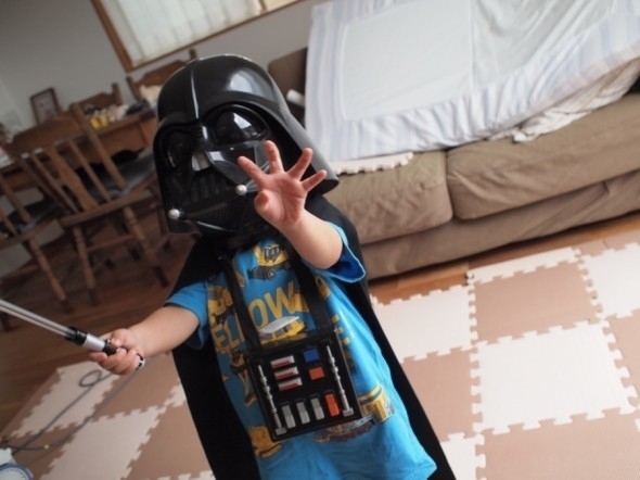 まぁ本来は大人用の仮面なわけで、3等身くらいのダースベイダーが家の中を走り回っています、、しかもけっこう静かに。。ボイスチェンジャー機能がついてるから、息子がしゃべった事が全部ダースベイダー仕様になるのです。。