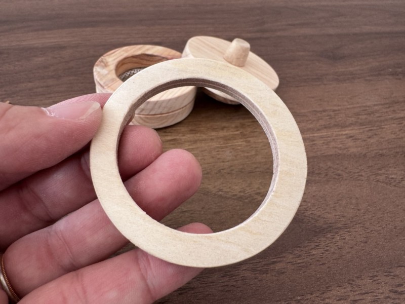 こんな感じで直径63mmの円を切り出す、ホールソーは中心を安定させるために真ん中にドリルがついているので、その中心を使って直径の小さなホールソーに切り替えて内側に再度穴を空けると、木のリングが出来上がる。