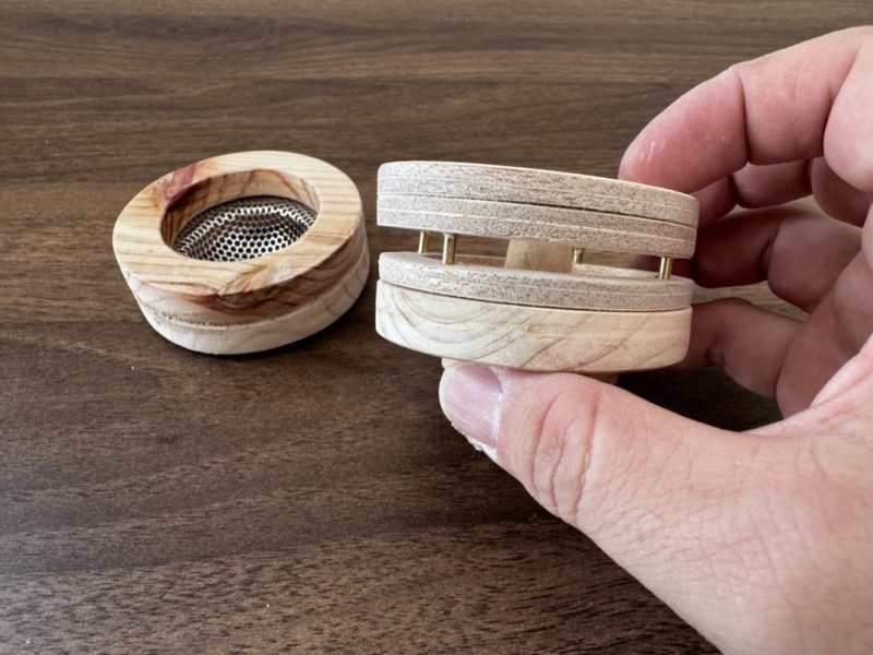 真鍮の針金が余っていたので、それを組み合わせて蓋部分に付けてみた。 デザイン性が上がりなおかつ蓋の重みが増すので、煙を外に逃がさないメリットもできた。