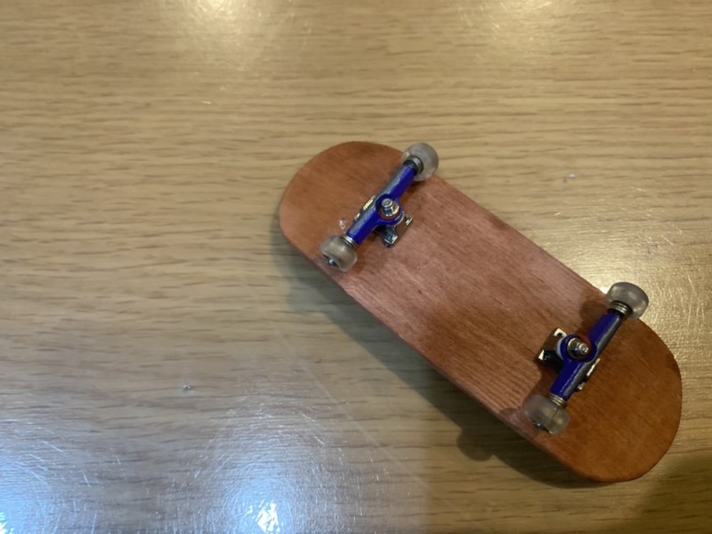 急にデッキの色が変わっているが、ニスを塗った工程の写真を撮り忘れたらしい(笑)マホガニーのニスを塗って乾燥させた状態。 トラックとホイールは、もともと持っていたフィンガーボード(指スケ)から取り外して装着しているが、見た目的にはかなり本格的なフィンガーボード(指スケ)に見える。