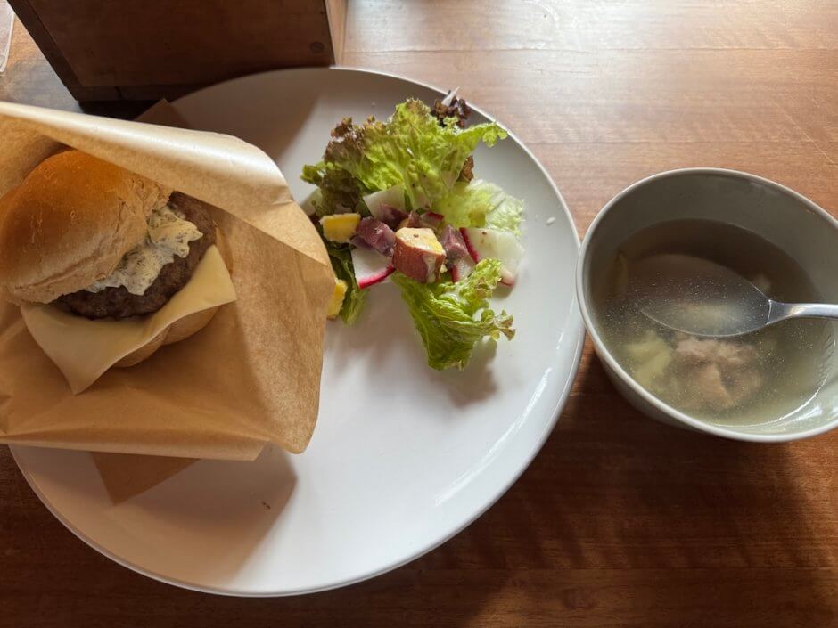 ジビエと聞くとクセがありそうなイメージがあるがまったくそんなことはない旨味のある美味しいハンバーガーとスープだった。