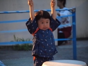 盆踊りも家で練習していたとおりバッチリ踊れたようです。 みんな浴衣や甚兵衛でチョコチョコしててカワイイです(^_^) それにしてもうちの息子.....ずば抜けて小さいな(笑)