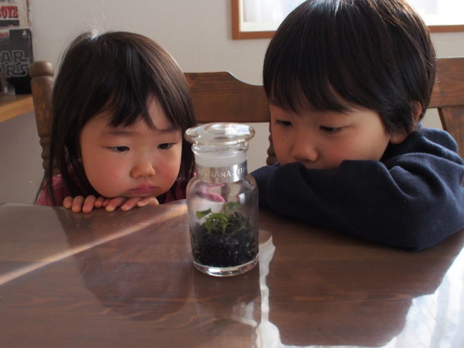 基本は陽の入る室内であれば何もしなくても育ちます、瓶の中では二酸化炭素→光合成→酸素が循環しているからたまに瓶の内側に水滴がつきます。
