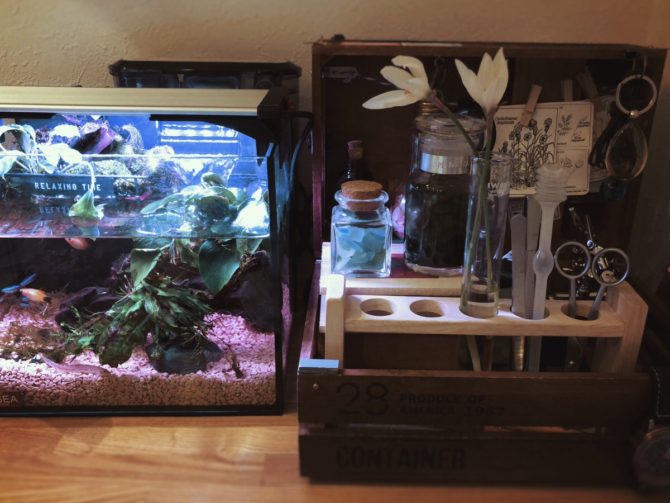 父は苔の採取とアクアリウム、娘は花々の採取で水槽のエリアがカオスな博士の机になってきてしまった。 #アクアリウム #リビングインテリア #実験キット -